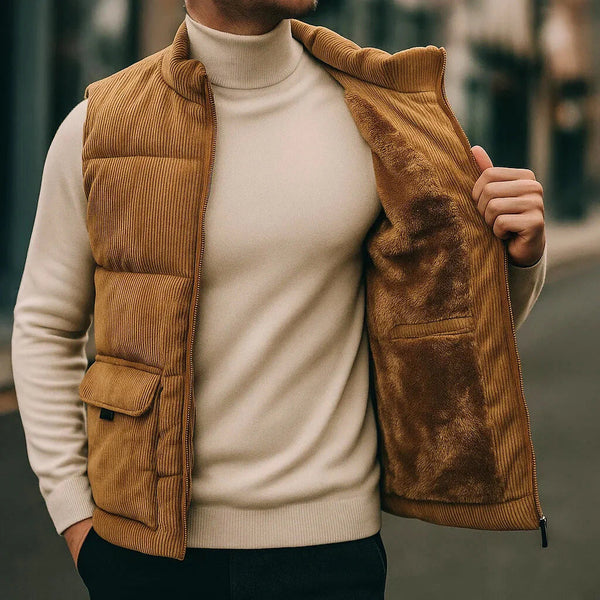 The vest has a modern slim fit. If you wear layers often, choose one size up for comfort. Check the size guide to match chest measurements for best fit.