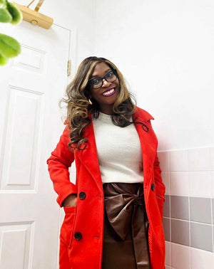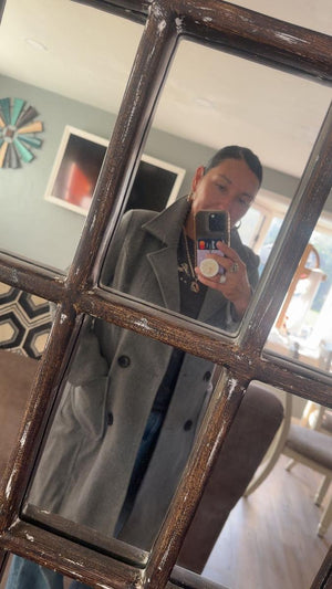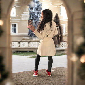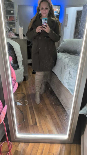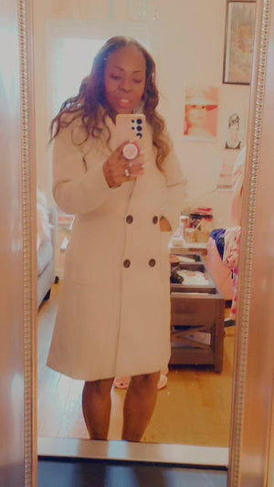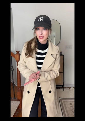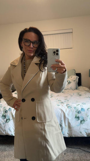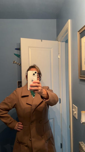 The mid-long, double-breasted silhouette creates a polished silhouette that hides layers. Look put-together stepping from the train to meetings while staying warm and professional.